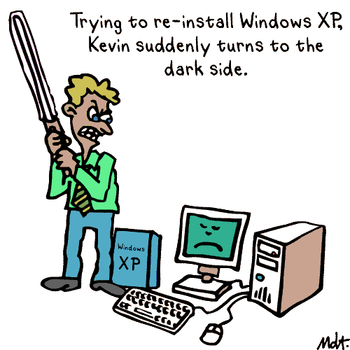 This was when I spent an entire day trying to reinstall my operating system. The problem was that my manufacturer didn't include any of the discs I needed. I was fuming by the end. |