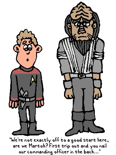 Mark, playing Martok the Klingon, was itching to get into combat in the Star Trek roleplay game. Unfortunately on his first attack, he rolled a 1 and accidentally shot his commander (played by Grant) in the back with a phaser on stun. |