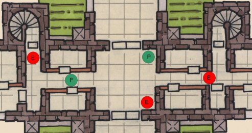 Here the players are in green, and the enemies are in red. Frazer(F) is on the left and Paul(P) is on the right.